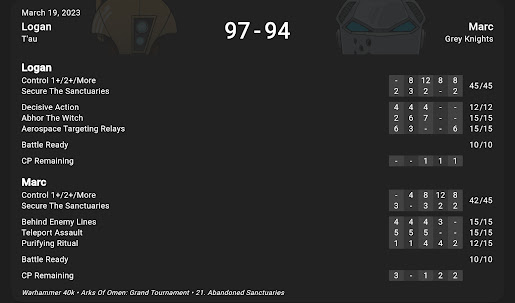 Always weird for my first game on the second day to be against my dad, but that's how random pairings be sometimes! This was a mission we had actually practiced the previous Monday (I lost). I learned from that and decided to play HYPER aggresive this match. With the long deployment I had both of my Coldstars redeploy into his back line and start clearing out his obsec before they could move out and start casting Purifying Ritual. His list can score max secondaries by Turn 3 so I had to play the denial game as I can only score 97 max with Decisive Action. Removing him from his back objective was key, and helped me get the last Aerospace Targeting Relay deployed.